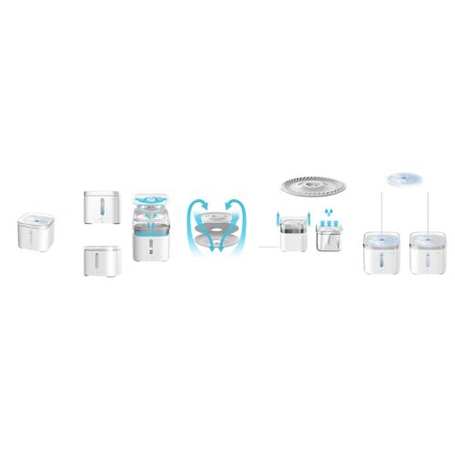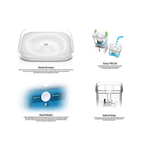 What makes this fountain so "smart"? The PETKIT EVERSWEET Dog and Cat Smart Fountain is designed to alert you when a refill is needed. An LED blue light reminder automatically lights up once water thresholds dip below a certain level. The water levels can also be seen easily through the built-in, see-through acrylic chamber. You can also set it to the 'Smart' mode function, which automatically shuts off when not in use, saving energy. Or use the 'Normal' mode function, which allows a continuous flow of water. Engineered to remove any noises due to splashing, the fountain is aesthetically pleasing, due to the infinity-flow concept that gently guides the water flow through perforated holes, not splashing it.
