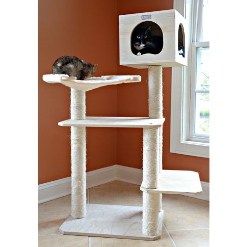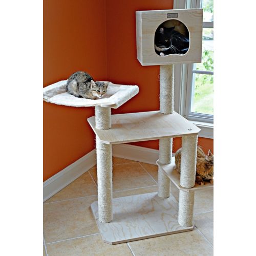 The Armarkat 50 Inch Premium Solid Wood Cat Tree is a solid tree perfect for multi cat households. It brings the open charm and adventure of the outdoors inside with the fresh fragrance of natural pine wood. It features 2 platforms and a hammock as well as a cozy cat condo with pad where your cat can hide and watch out over everything. It is outfitted with 7 sisal wrapped scratching posts, which means your cat will have plenty of places to scratch and stretch and get out their energy.