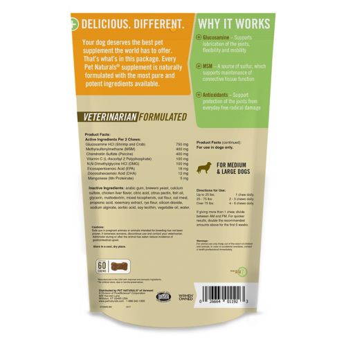 Pet Naturals of Vermont Hip and Joint Chew for Medium/Large Dogs is specially formulated for dogs 25 to 75 pounds. It is a comprehensive formula for the support of joint structure, function and flexibility. Formulated by veterinarians, this supplement is designed for dogs that are showing signs of aging and discomfort in their daily activities. With recognized ingredients like glucosamine, MSM and chondroitin and the inclusion of DMG, EPA and DHA, these highly palatable soft chews will help your dog be their happy, active self again.