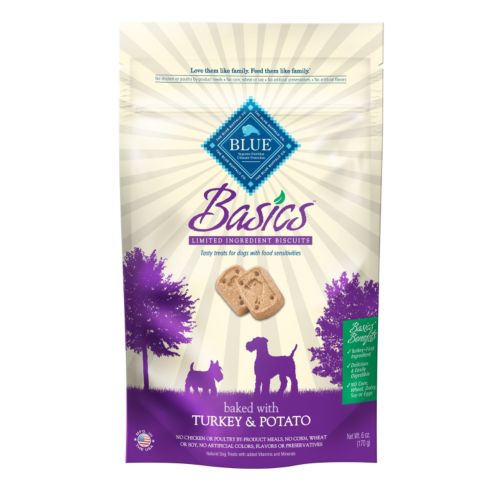 Blue Buffalo Basics Dog Biscuits are made from a simple recipe with a limited number of natural ingredients, and the perfect treat for dogs with food sensitivities. Oven-baked for crunchy goodness, Basics Biscuits have either Turkey or Salmon as their first ingredient. Delicious and nutritious, these items are not commonly used in dog food or treats, which makes them ideal protein sources for dogs with food sensitivities. Basics Biscuits also contain some of nature's most healthy and highly digestible ingredients, such as oatmeal, brown rice, carrots, flaxseed, and potato.