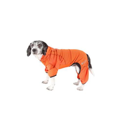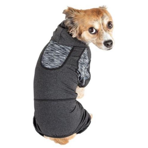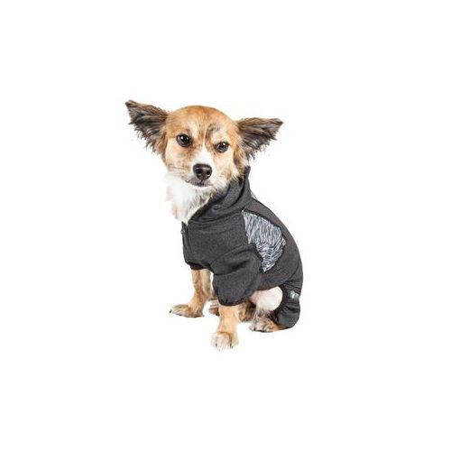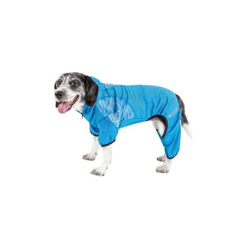 The Pet Life Active Pawsterity Full Body Dog Hoodie is geared with a performance system that offers year-round protection. It cools and warms the body by maintaining body temperature. It features both a lightweight and medium weight dual formulated state of the art innovative nano-stitched yoga-like fabric that when combined helps maximize performance with a higher grade of breathability and stretch. The lighter ventilation is strategically mapped in areas of need, while the entire body offers breathability. It features a 4-way stretch construction that moves better in every direction with a looser and full cut for comfort. The material featuers quick-drying properties that dry really fast while offering anti-odor technology that assists with odor causing microbes. It also offers UV protection against the suns harmful rays and is fitted to help assist in the containment of shedding hairs. It has dual reinforced stitching at every seam for durability with a stretchy band throughout the body that expands for added growth room. The design also features a leash-slit along the backside, a pull-over hood and a zipper underneath for convenient on and off access with reflective taping for added night visibility.