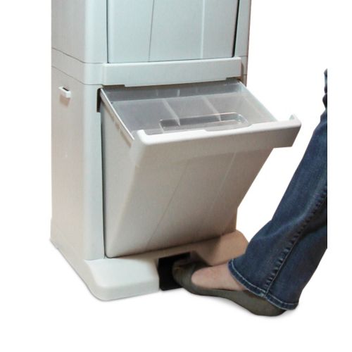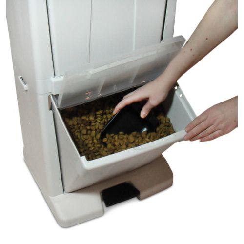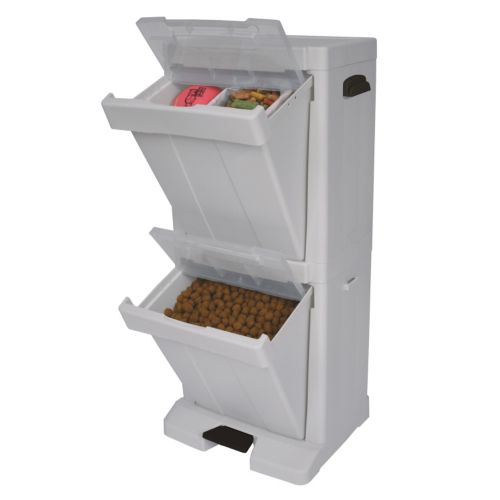 Because pets need space to store their personal stuff too, Richell's Pet Stuff Tower™ is the perfect solution for storing dry food, treats, toys, and more in one easy-to-reach location! The tower contains two storage bins with snap-lock lids to keep freshness in and pests out. The bottom bin has a foot pedal for convenient hands-free access to pet food plus side hooks to hold leashes and bags. A 1.5 cup food scoop is included. Assembly required.