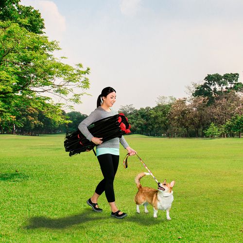 If you are looking for a play yard or containment option for your young dog that is truly portable, take a look a the Carlson Red Six Panel Portable Play Pen. Creating a safe play area for your animal in seconds the lightweight, foldable, pet pen is ideal for home, when traveling, at the park, or camping. This attractive pet pen is equipped with reinforced mesh throughout and accommodates a variety of dog breeds. For added convenience, the portable pet pen includes a small pet door that zips open for easy access. The instant set up of the pen makes it an ideal play yard or containment choice for indoor or outdoor use.