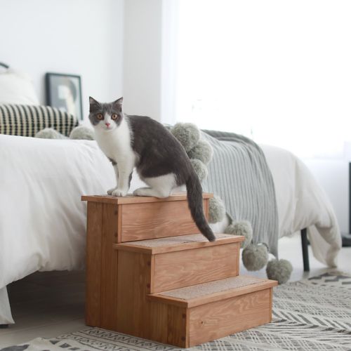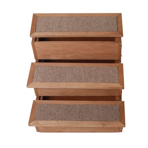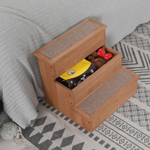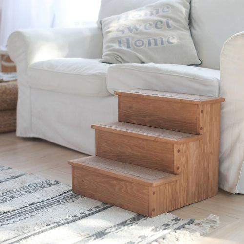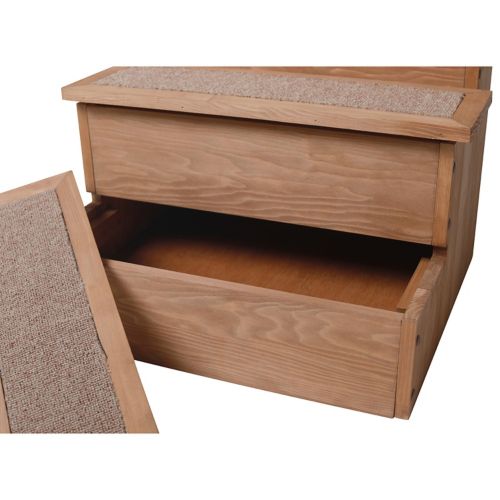 The Merry Products Yorkshire Pet Step with Storage is functional and stylish. The traditional step design makes it easy for dogs and cats to get on the bed or couch. The carpeted steps allow your pet to grip so they don't slip going up or down. The interior is one large storage space with three lids to store your pet's toys and other accessories. It is made form quality Canadian Hemlock with an oil-based stain.