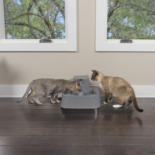 The PetSafe Drinkwell 2-Gallon Pet Fountain is designed with you and your pet in mind. This automatic water bowl features a free-falling water stream with adjustable flow control you can tailor to your pet's needs. Choose from nearly silent circulation on the lowest setting to a tranquil stream on the highest. The large capacity bowl is perfect for big dogs and multiple pet households. The square bowl design is large enough for several pets to drink out of at the same time with minimal splashing. When it's time to refill, simply use a pitcher to fill the bowl to the desired level.