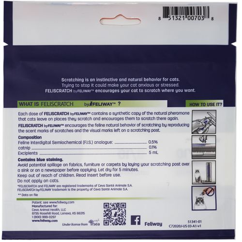 When scratching, cats mark their territory by leaving visual and chemical messages from their paws. This scent message, undetectable to humans, is a pheromone known as the feline interdigital semiochemical. Scratching can also be a sign of stress in cats. When applied to the desired scratching surface, FELISCRATCH mimics the visual and chemical signals that encourage the cat to scratch there again. It has been clinically proven to help reduce or stop unwanted scratching in the home.
