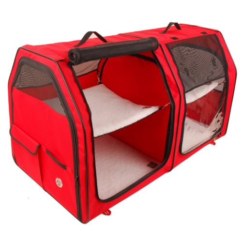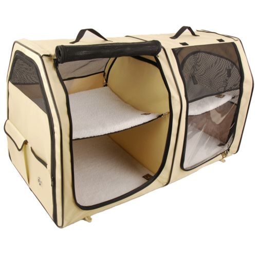 The One for Pets Portable Fabric Kennel and Cat Show House is a terrace-design, heavy-duty canvas and mesh kennel that can be used as a pet house at home, or a cat show house. It sets up easily, stores conveniently, and is an essential piece used by breeders. It features a spacious interior, a flat top to hold photos and show essentials, double front doors and zippered side doors for easy access, zippered interior central divider to create two separate compartments as well as a one large space, and interior ceiling ring for hanging toys.