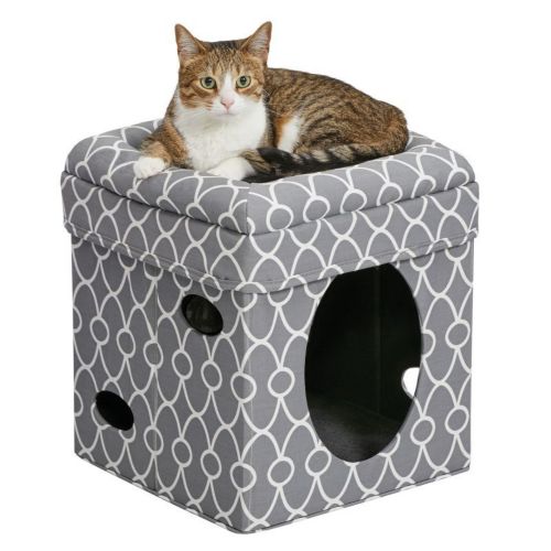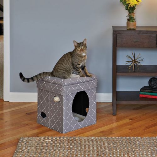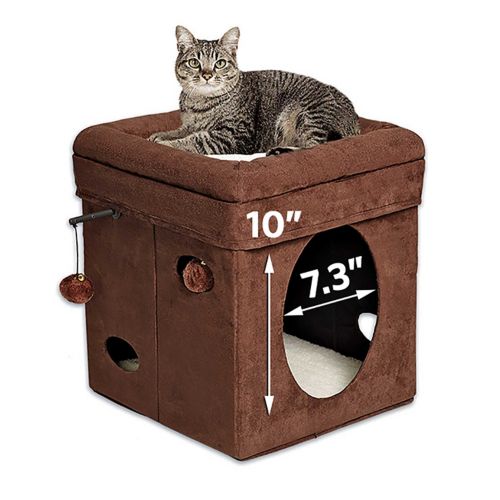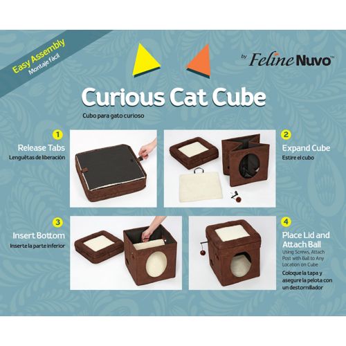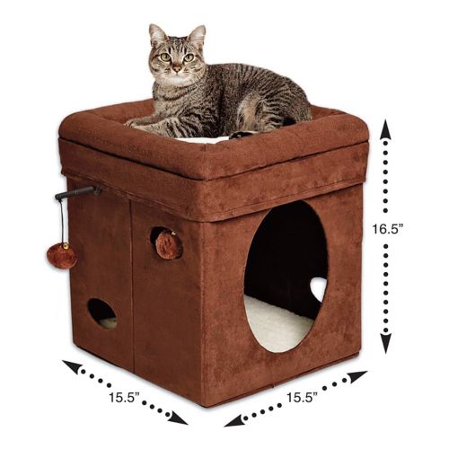 The Curious Cat Cube is an attractive, easy-to-assemble kitty cube that features a cushioned top bed with soft bolsters, hide-and-seek side cut-outs, and hanging plush toys with jingle bell. Made with soft faux-suede and synthetic sheepskin, the Curious Cat Cube will soon become your cat’s favorite hangout.