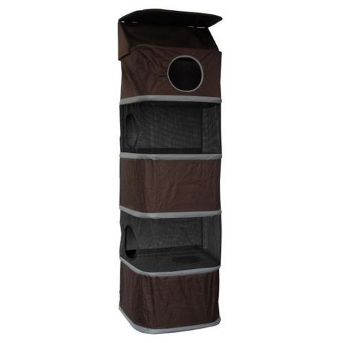 The All-in-One comes with four spacious compartments that feature removable dividers to create bigger areas. The easy-to-use design allows for wall mounting or for hanging on door. Made with a durable metal frame, heavy-duty nylon canvas, the All-in-One Cat Activity Tower features removable, washable plush mat for each level.
