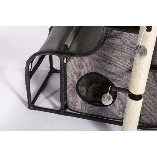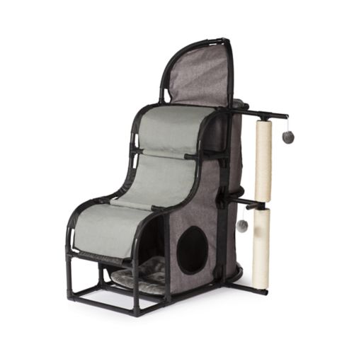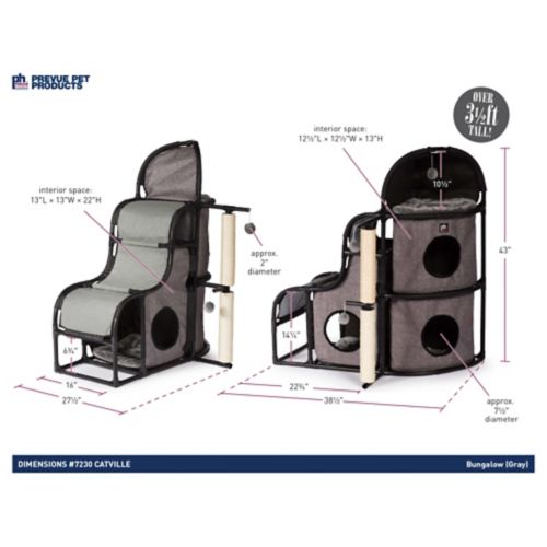 The Prevue Catville Bungalow encourages your cat to be healthy, happy, and active. Cats will engage in frisky activity playing with the dangling toys, scratching on the posts, or climbing in, out, over and around the bungalow. There are four hideaways – a penthouse nook with dangling puff ball, two secluded dens, and a lower leverl covered area, all with super soft mats. The hideaways provide ideal spots for lounging, sleeping, or hiding. A full range of amenities will satisfy behavioral instincts while discouraging destructive behavior and alleviating boredom in cats of all ages. The structure is sturdy, yet lightweight, so it will stand up to play, but can be easily moved around. It will provide hours of fun for your best feline friend.