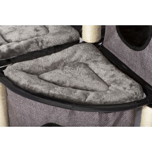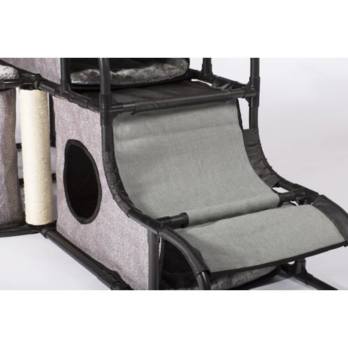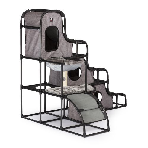 The Prevue Catville Tower encourages your cat to be healthy, happy, and active. Cats will engage in frisky activity playing with the dangling toys, scratching on the posts, or climbing in, out, over, and around the tower. There are four hideaways on three levels – a penthouse nook and three dens, all with super-soft plush mats, plus a hammock. The hideaways provide ideal spots for lounging, sleeping, or hiding. A full range of amenities will satisfy behavioral instincts while discouraging destructive behavior and alleviating boredom in cats of all ages. The structure is sturdy, yet lightweight, so it will stand up to play, but can be easily moved around. It will provide hours of fun for your best feline friend.