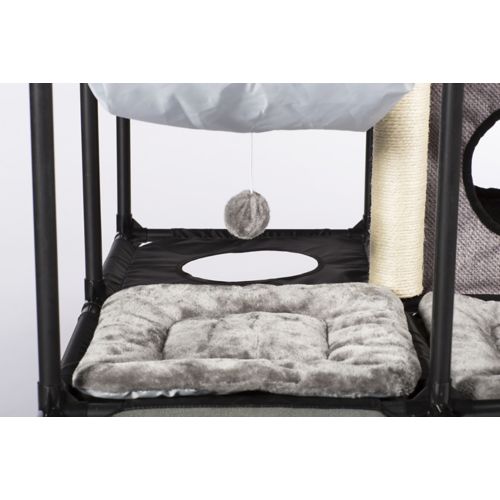 Dangling toys and scratching posts add to the fun
