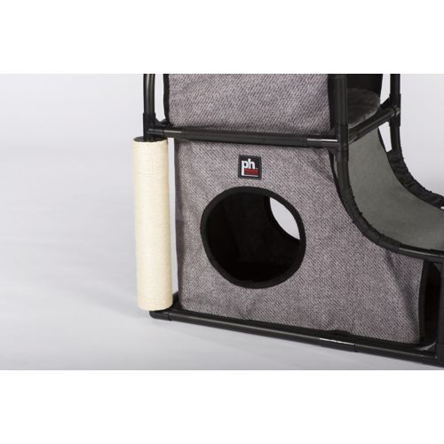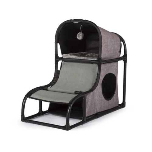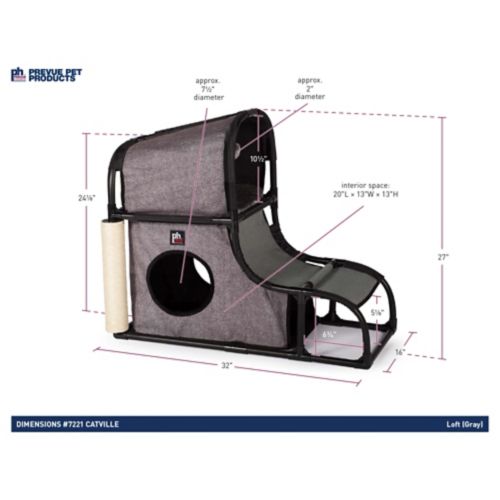 The Prevue Catville Loft encourages your cat to be healthy, happy, and active. Cats will engage in frisky activity playing with the dangling toy, scratching on the post, or climbing in, out, over, and around the loft. There are two hideaways, which provide ideal spots for lounging, sleeping, or hiding. A full range of amenities will satisfy behavioral instincts while discouraging destructive behavior and alleviating boredom in cats of all ages. The structure is sturdy, yet lightweight, so it will stand up to play, but can be easily moved around. It will provide hours of fun for your best feline friend.