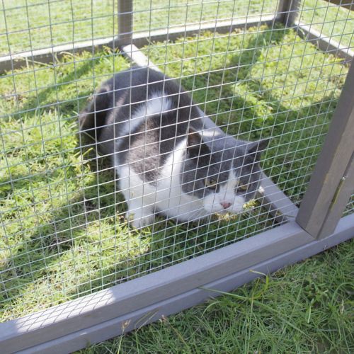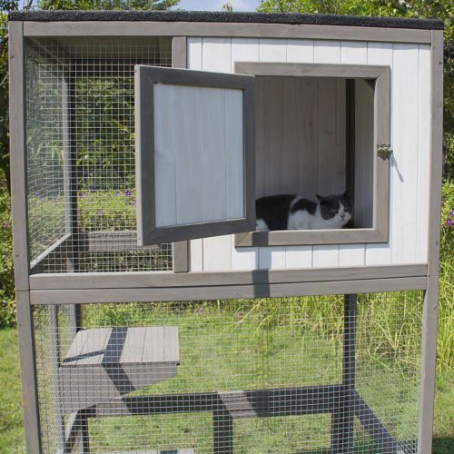 The Merry Products Cat Climber is great for indoor and outdoor use. It has a partially enclosed house shelter area has a large run area for your cat. The interior climbing platforms are great for getting to the top platform or taking little naps. The black asphalt roof panel will hold up to the weather. It is made from quality Canadian Hemlock and finished with a water based stain to make it durable. It is easy to assemble.