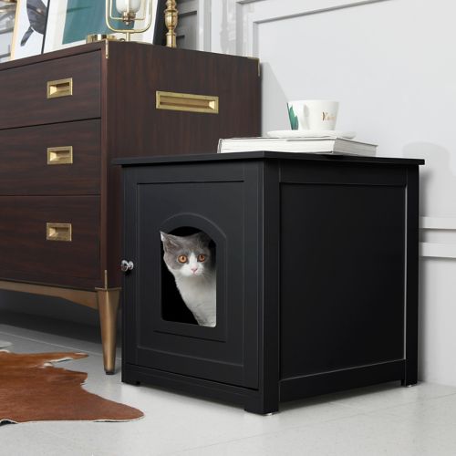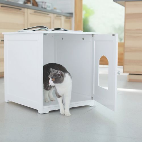 The Merry Products Kitty Litter Loo is a perfect combination of style and function. It is a great way to keep the litter box out of sight will still allowing your cat to have easy access to it. The classically stylish framed panels make it great for any decor. It fits most cat pans. The door opens for easy litter changes. The cat door is nice and roomy for most cats. It is made from MDF with a durable painted finish, so it is sure to last.