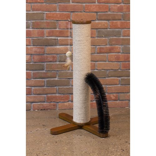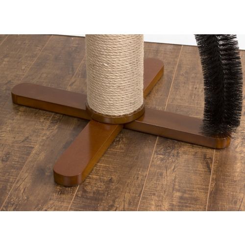 The Merry Products Purfect 3 in 1 Cat Scratcher Post is a great way to keep your cat happy and entertained. Scratching rope is wrapped on the full length of the post to give your cat plenty of space to stretch and scratch. Grooming bristles attached to the side helps groom their fur as they brush on by. A feathered toy dangles for batting fun. The X-frame base creates a large, sturdy footprint. Made from MDF, it is durable and sturdy.