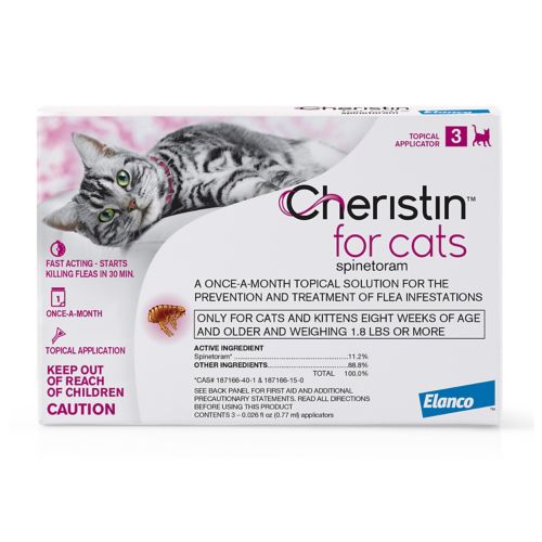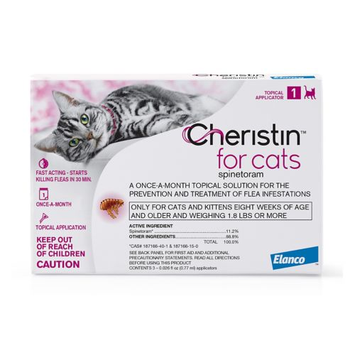Cheristin Flea Topical is a flea treatment specifically formulated for cats. Easy to apply, quick-drying, and non-greasy, it is gently delivered by a small applicator with a rounded tip and starts killing fleas within 30 minutes. Cheristin's low-volume dose is gentle enough for all cats and kittens eight weeks of age and older that weigh 1.8 pounds or greater. The active ingredient, spinetoram, received a 2008 Presidential Green Chemistry award for low environmental impact on the agricultural industry.