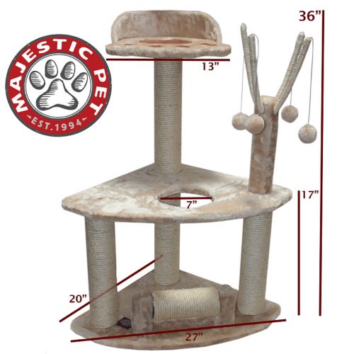The Majestic Pet 36 inch Casita Cat Tree is covered in plush, soft faux fur with sisal rope covered posts to withstand even the toughest claws. This beautifully designed kitty playground features a spinning sisal scratcher, an upper platform with a porthole entrance, multiple dangling tether balls, and an elevated cat paw perch. The Majestic Pet 36 inch Casita Cat Tree assembles in minutes with simple step by step instructions and tools provided.