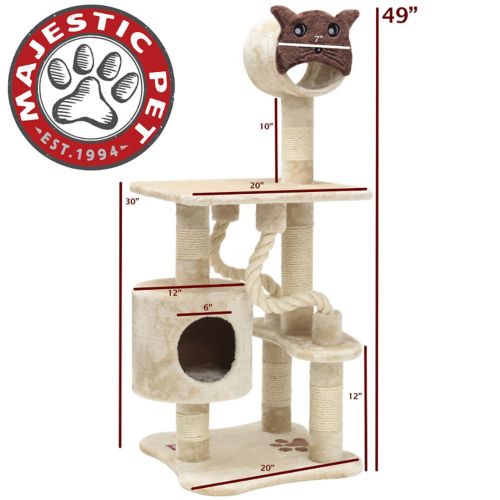 The Majestic Pet 49 inch Casita Cat Tree is covered in plush, soft faux fur with sisal rope covered posts to withstand even the toughest claws. This beautifully designed kitty playground features multiple rope toys, a round cat house with a porthole entrance, a large look-out platform, and an elevated cat-face mini-tunnel. The Majestic Pet 49 inch Casita Cat Tree assembles in minutes with simple step by step instructions and tools provided.