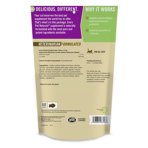 Pet Naturals of Vermont L Lysine Chews for Cats is a daily supplement for your cat to support immune health. The formula also promotes tissue repair and collagen formation. L-Lysine is an essential amino acids used by the pet's body as a building block for many functions important to growth and maintenance of health. It is recommended to support immune system function, collagen formation, tissue integrity, antioxidant activity, and antibody and lymphocyte production. It is safe for kittens and senior cats. It is the perfect supplement for multi-cat households and boarding. It is delivered in a delicious chicken liver flavored chew that your cat will love.