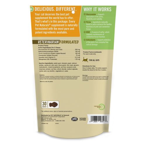 When kitty seems to have lost some power in her pounce, it may be time for added joint support. Pet Naturals of Vermont Hip+Joint is formulated using naturally sourced ingredients and contains no harmful chemical preservatives such as BHA or BHT. This formula for hip and joint care includes more active ingredients than other leading brands including glucosamine and chondroitin as well as Perna for maximum nutritional absorption and effectiveness. Containing 6 beneficial ingredients, it will provide the building blocks essential for healthy joints. All of this in a delicious, fish-flavored chew she’ll loveߞat a price you’ll love.