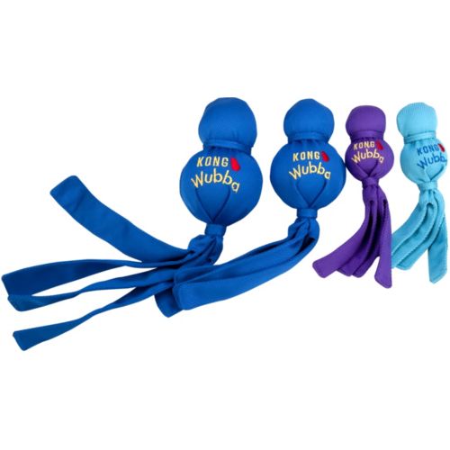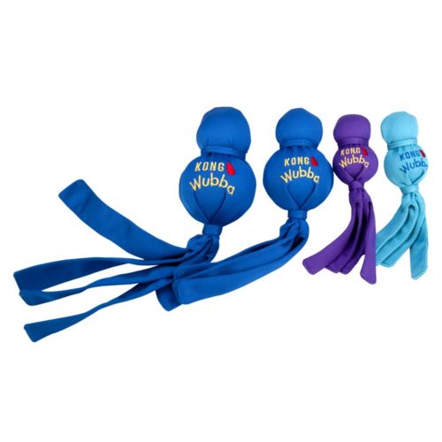 The KONG Wubba Dog Toy is an interactive tug, toss, and squeak toy. Durable nylon fabric covers two rubber balls. The long tail allows for easy pickup and tossing. Available in four sizes to accommodates most size dogs.
