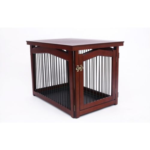 The Merry Pet Configurable Pet Crate and Gate provides your dog a secure place to sleep and play. The crate includes a solid wood veneer cover that will compliment any home décor and doubles as a table. The pin hinge design allows for numerous configurations to fit any opening when using as a gate.