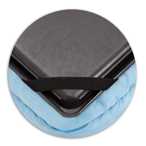 Elastic corner straps secure bed to crate pan to prevent sliding and bunching