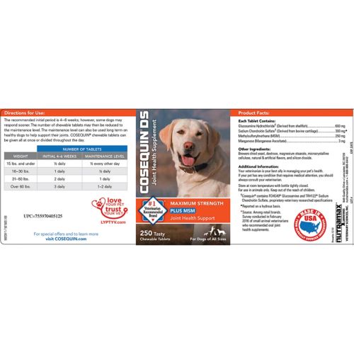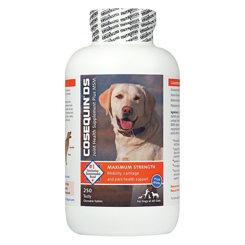 Cosequin DS Maximum Strength Plus MSM chewable tablets bring the benefit of sulfur, a vital building block for joints, cartilage, skin hair, and nails, to support mobility for a healthy lifestyle. They contain FCHG49® Glucosamine Hydrochloride, TRH122® Sodium Chondroitin Sulfate, and MSM (Methylsulfonylmethane), a combination of ingredients the helps to protect your dog's joints and support healthy cartilage matrix production.
