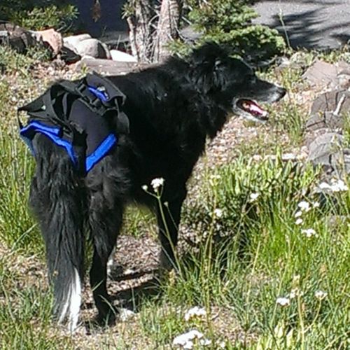 Notes: The Walkabout Back end harness closes over the top. Legs go thru holes, blue side is the inside. Velcro closes on the top of the dog. The cutout faces the back.