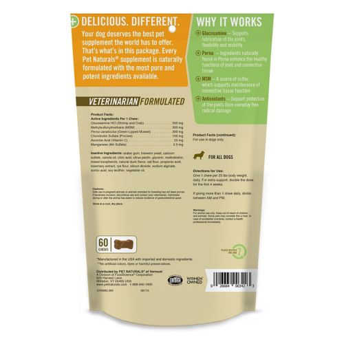 When your dog gets up more slowly to greet you, you know he’s not just tired. It may be time for added joint support. The Pet Naturals of Vermont Hip And Joint Pro Chew for Dogs is a supplement that provides advanced nutritional joint support for working dog breeds, as well as competitive and senior dogs. It is formulated using naturally-sourced ingredients and contains no harmful chemical preservatives, such as BHA or BHT. This formula for hip and joint care includes more active ingredients than other leading brands, including glucosamine and chondroitin, as well as Perna for maximum nutritional absorption and effectiveness, all in a delicious, duck-flavored chew. Containing six beneficial ingredients, PetNaturals Hip and Joint for Dogs will provide the building blocks essential for healthy joints.