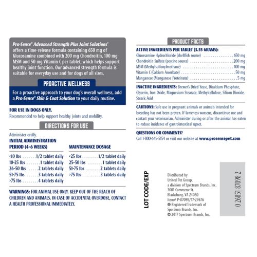 Pet parenting can be tough, which is why Pro-Sense products offer a variety of proactive, sensible solutions with improved ingredients and benefits for all of your pet’s healthcare and wellness needs, to make it easier than ever to care for them like any other member of your family. Pro-Sense Advanced Strength Plus Joint Solutions is a time-release formula that combines 650mg of Glucosamine combined 200mg Chondroitin, 100mg MSM and 50mg Vitamin C per tablet to help support healthy joint function. The advanced strength formula is suitable for everyday use and for dogs of all sizes.