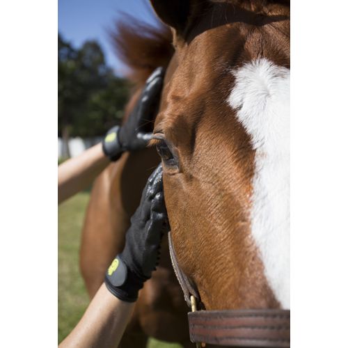 HandsOn® Gloves are an innovative concept in bathing and grooming your horses, dogs and other animals. The unique scrubbing nodules on the fingers and palms massage the animal's muscles, stimulate circulation, and distribute natural oils for healthy skin and coat. They are tough enough to scrub caked mud off the body, yet gentle and flexible enough to use on face and legs and more sensitive, contoured places. These gloves can be used wet or dry and will not slip off when soapy. They’re also great for shedding, as hair won’t stick to the gloves.