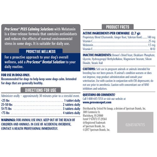 Pro-Sense® PLUS Calming Solutions With Melatonin is a time-release formula that contains antioxidants and reduces the effects of normal environmental stress in some dogs. This supplement is suitable for daily use, with best results when administered orally, approximately 30 minutes prior to a stressful event.