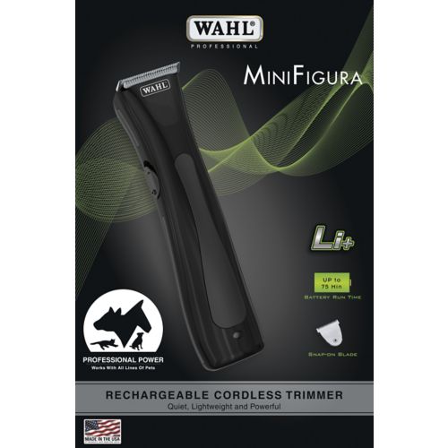 The Wahl® MiniFigura Power Lithium Ion Trimmer is a powerful cool running rechargeable trimmer with 75 minutes of cordless operation and only a 60-minute full-charge time. Quiet and lightweight, the MiniFigura has a powerful 6,000 strokes per minute with low vibration. Its ergonomic curved design provides maximum comfort and control for all your trimming needs.