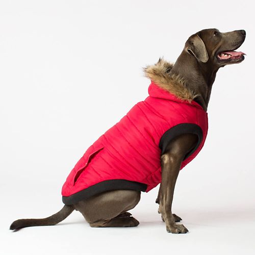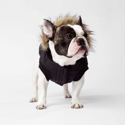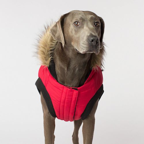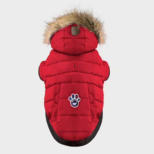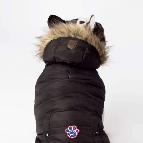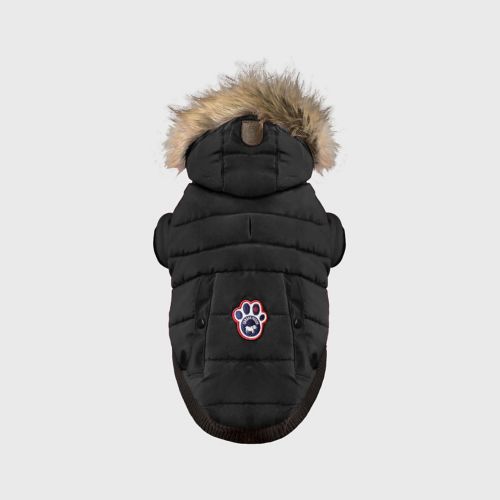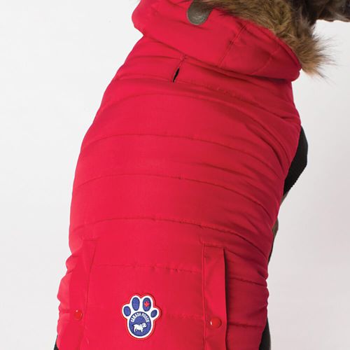 Protect your pooch on the coldest of days with the North Pole Parka from Canada Pooch. This puffy, water-resistant parka is a perfect combination of style and function. The water-resistant shell keeps your dog dry in the wettest of conditions. The soft fleece lining and thick quilted faux-down insulation keeps your dog warm and comfortable. The North Pole Parka features two functional pockets that can be secured shut with snaps. Your pup can comfortably carry around poop bags, treats and of course a doggie cell phone. A slit in the parka makes for easy leash and harness attachment. A dual Velcro closure makes it easy to get a secure, custom fit. Ribbing detail along the bottom and sleeves ensures a snug fit, and that the coat will comfortably stay in place as your pooch runs, plays and lounges. The faux-leather patch is a subtle but elevated hood detail denoting this style is part of the Canada Pooch heritage collection.