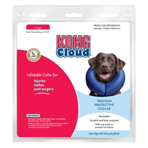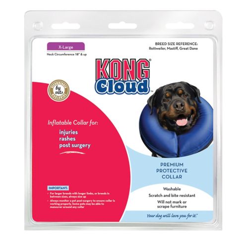 The KONG Cloud Collar is soft, smooth, and doesn't interfere with a dog's peripheral vision or get in the way of eating and drinking. These collars are designed to be washable, scratch- and bite-resistant, and do not mark up floors or furniture.