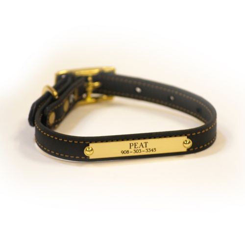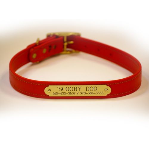 The Personalized Stitched Synthetic Dog Collar is a great combination of style and function. The beautifully crafted synthetic material has the look and durability of leather. The ornamental brass plate enhances the beauty while being functional at the same time. You can personalize up to two lines of text, with 25 characters per line. A brass buckle closure makes it easy to get the perfect fit.