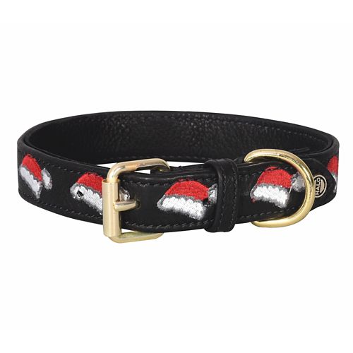 The Halo Santa Hat Leather Dog Collar will show off your dog's holiday spirit in the cutest way! It features quality bridle leather, overlaid with an embroidered Santa hat design. The brass buckle complements the leather and makes it easy to get that perfect fit. A brass D ring makes it easy to clip a leash to the collar.