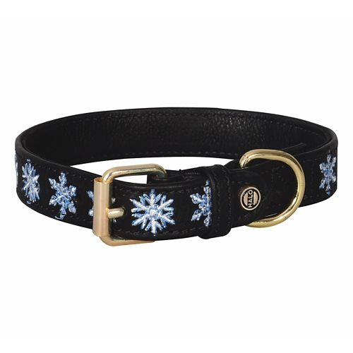 The Halo Snowflake Leather Dog Collar is perfect for the holidays and the entire winter season. It features quality bridle leather, overlaid with an embroidered snowflake design. The brass buckle complements the leather and makes it easy to get that perfect fit. A brass D ring makes it easy to clip a leash to the collar.