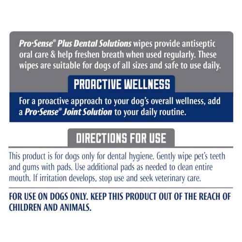 Pro-Sense Plus Dental Solutions Wipes provide antiseptic oral care and help freshen breath when used regularly. When used as directed, these peppermint-flavored wipes help reduce plaque and tartar buildup, and are suitable for dogs of all sizes.