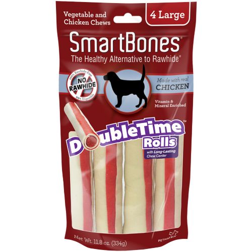 Double the fun, double the taste, all in one! SmartBones® DoubleTime™ Rolls Dog Chews are made with the superior rawhide-free quality chew you and your dog love, with a tasty all-natural long lasting chewy chicken center inside. It's the next generation of dog chew, with all the benefits of a rawhide chew – without the rawhide.