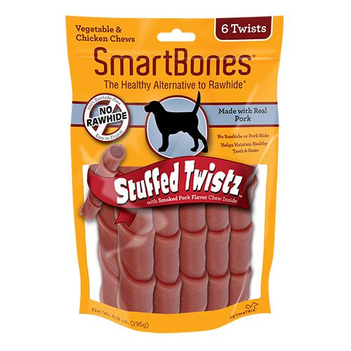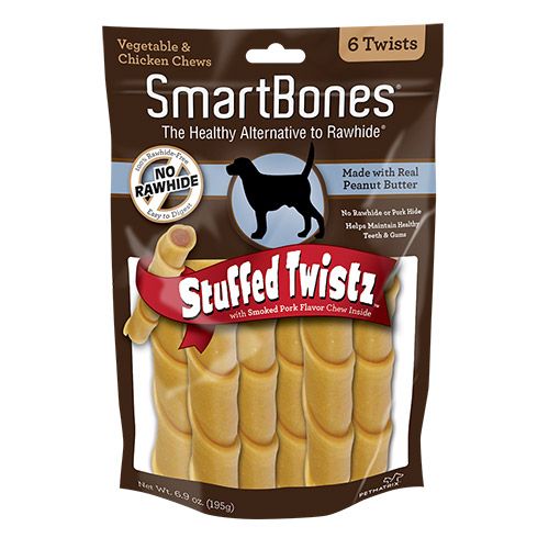 SmartBones have all the benefits of a rawhide chew, but without the rawhide! Many veterinarians are concerned with the potential health risks associated with dogs consuming rawhide. SmartBones® Stuffed Twistz are made with tantalizing wholesome vegetables and real chicken, and are stuffed with a delicious pork or peanut butter flavor chew center for a scrumptious taste dogs can't resist.