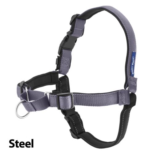 Easy to fit and comfortable to wear, the PetSafe Deluxe Easy Walk Dog Harness gently discourages your dog from pulling on the leash. The front chest leash attachment helps you steer your dog and redirect his or her attention toward you, making it perfect for teaching dogs to walk nicely on a leash. Padded, neoprene line chest straps rest across the dog's breastbone, preventing gagging and choking. Quick-snap buckles on the shoulder and belly straps make for easy on-and-off. Four adjustable points provide maximum comfort and a reliable fit. The belly strap is a complimentary color, making it easy to tell which strap goes over the shoulders and which goes under the belly.