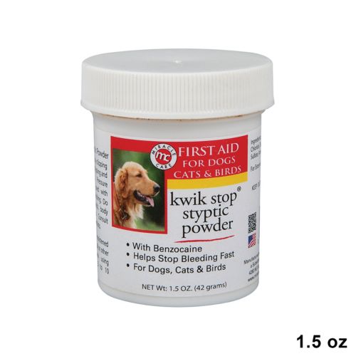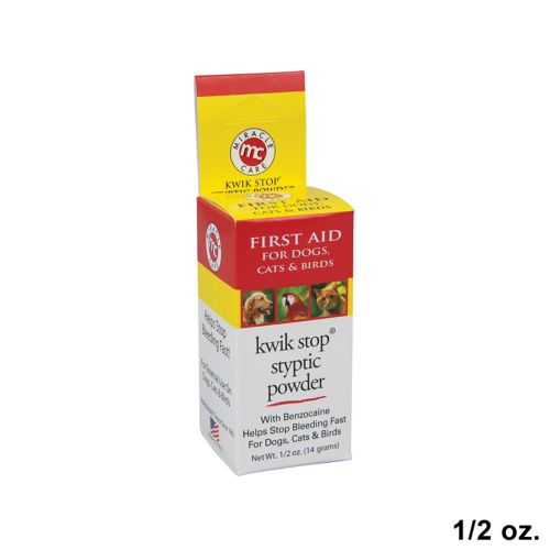 Kwik-Stop Styptic Powder now contains Benzocaine for pain relief. For use on dogs, cats, and birds, it will stop bleeding caused by clipping nails, docking tails, trimming beaks, and minor cuts. The veterinarian-approved formula can be applied with a cotton applicator or finger tip. For external use only.