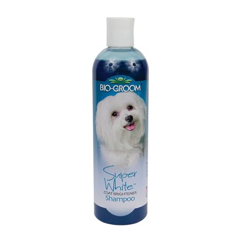 Fighting the war against dingy, one pup at a time! Super White™ Coat Brightening Shampoo by Bio-Groom® makes white coats sparkle. Developed for white and other light colored coats and fortified with protein, it cleans thoroughly while adding luster and body to the coat without harsh bleaching. Super White® controls matting, tangling, and fly-away hair. Its rich lather rinses out easily, and with a fresh clean smell.