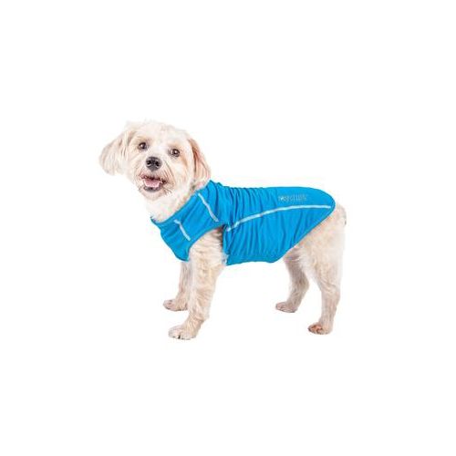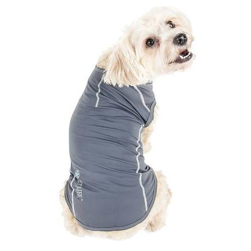 The Pet Life Racerbark Dog Shirt is comprised of a lightweight and stretchy yoga-like performance fabric that maximizes mobility and comfort. It features a 4-way stretch construction that moves better in every direction with a customized fit that's further than next to skin or fur without the squeeze and won't bunch up. This specially formulated stretchy Micro-Fiber features a higher-grade of elasticity that won't ever lose it's shape and is permeable which provides breathability. This smooth-to-the-touch fabric features quick-drying properties that repels body moisture or sweat and features anti-odor technology that assists with odor causing microbes. The Racerbark is also UV protectant against the suns harmful rays and strategically fitted to help assist in containment of shedded hairs. Design features dual reinforned stitching at every seam for added durability with a pull-over design for easy on and off access and reflective-taping for added night visibility.