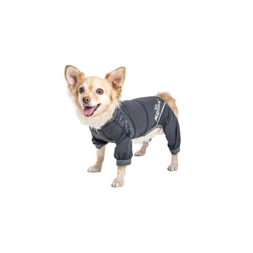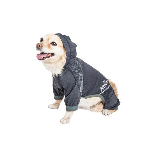 Helios Namastail Dog Hoodie Tracksuit is all about next-level tranquility and complete flexibility. The entire body features specially engineered lightweight ultra-elastic fabrics that fuse together for maximum flexibility, mobility and breathability that is also permeable. The main Exo-shell features Elastane and Spandex with 4-way stretch technology that moves in every direction. The Namastail Dog Hoodie also features well-coordinated strategically placed perforated stretchy fabrication trims for strategic ventilation that adds to the breathability. This Yoga Dog Tracksuit also features elasticity around the sleeves and the body for a perfectly uniform fit with added growth room that almost feels like a secondary skin. It features Dual-Reinforced stitching at every seam for durability and stability with added reflective lining along the outside for night protection. Additionally, the main exo-shell and trims both feature quick-drying technology that dries rapidly and while offering anti-odor technology that prevents odor causing microbes. It assists with UV Protection against the suns harmful rays and fitted perfectly to help assist in containment or collection of shedded hairs. Features an easy on and off pull over design and an accented pull-over hood with a leash-slit along the back.