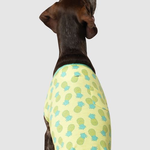 The Canada Pooch Pineapples Follow Me Dog Tee is a soft and stylish T-shirt with a playful print. The lightweight cotton blended fabric is perfect for spring and summer days. A functional stitched pocket adds a touch of fun, while a stylish ringer binding collar and hem accent the pattern nicely. There is even a slit for easy leash attachment!