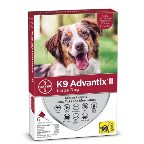 K9 Advantix II delivers pest protection through topical action. It protects against fleas (flea eggs and larvae), ticks, mosquitoes, biting flies, and lice. It combines imidacloprid and permethrin with insect growth regulator pyriproxyfen, which interferes with the hormone signaling of molting insects so that fleas in immature stages are unable to molt. K9 Advantix II is for monthly use on puppie as young as 7 weeks old and dogs. Do not use on cats.